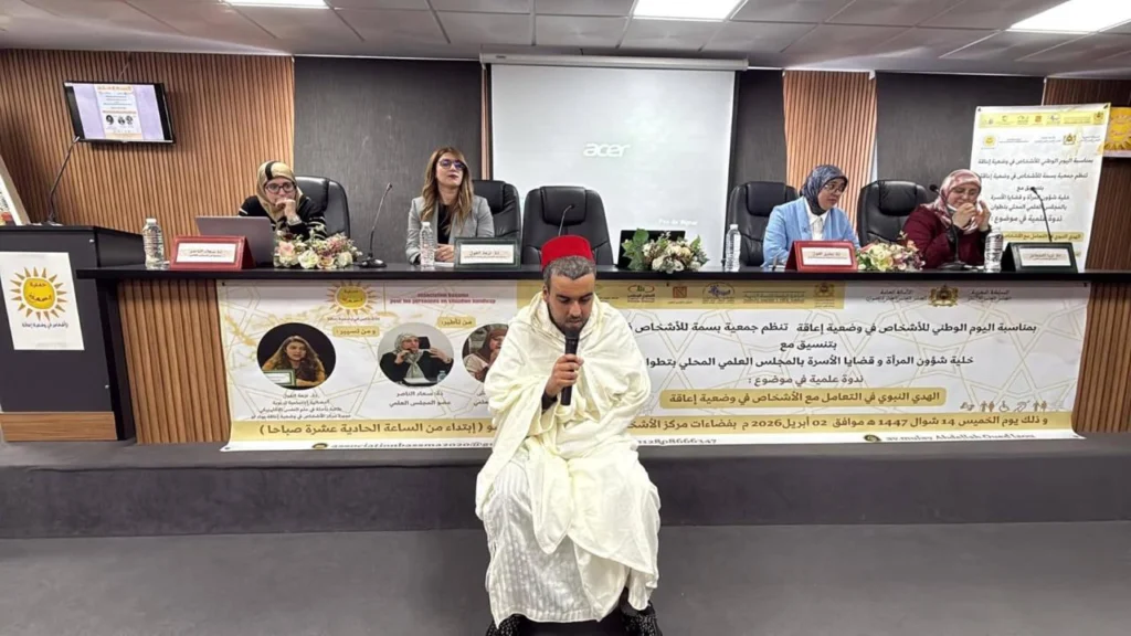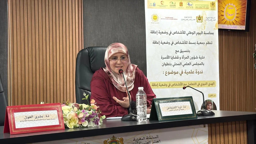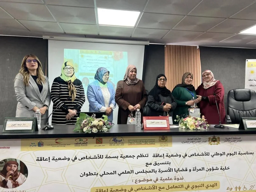 في إطار تنزيله لمضامين الرسالة الملكية السامية الخاصة بالاحتفال بمرور 15 قرنا على ميلاد خير البرية عليه الصلاة والسلام، وبمناسبة اليوم الوطني للأشخاص في وضعية إعاقة نظمت خلية شؤون المرأة وقضايا الأسرة التابعة للمجلس العلمي بتطوان بشراكة مع جمعية بسمة للأشخاص في وضعية إعاقة يوم الخميس 14 شوال 1447هـ/ موافق 2 أبريل 2026، بفضاءات مركز الأشخاص في وضعية إعاقة بوادلو ندوة علمية في موضوع: